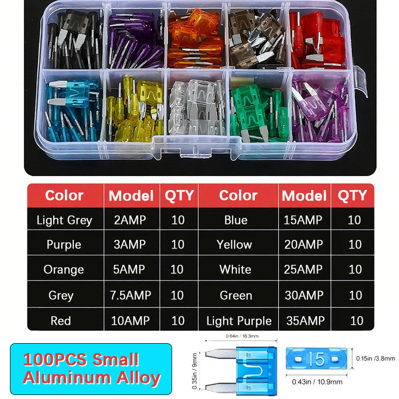 100pcs Car Fuse Assortment Set Profile Middle Size smll mini size Blade Type Fuse Auto Car Truck 2-35A Fuse Aluminum Alloy Zinc Alloy