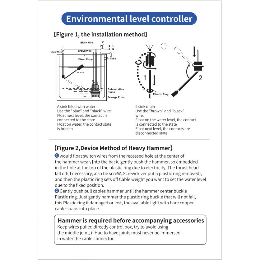 When the float head is downward, the power is connected to start the water pump. The rising water level of the water tank drives the float to rise. When the float head is upward, the internal steel ball falls, the power is disconnected, and the water pump stops. After water is used, the float head falls back downward, and the power connection cycles.