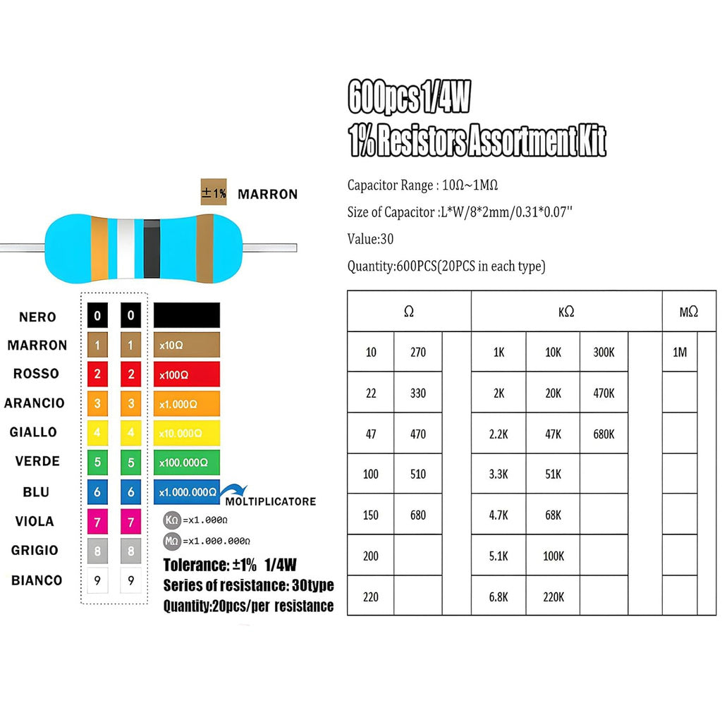 300pcs 600pcs 1/4W Resistance 1% 30 Kind Each 10pcs/20pcs Film Resistor Assorted Kit with box