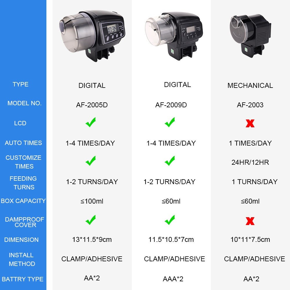 - Automatic Fish feeder: This timed fish feeder can feed fish automatically by simply setting. Never need to worry about the feeding problems when vacationing or on business. You can set up the fish food amount, feed times when to feed the fish, manual or automatic.