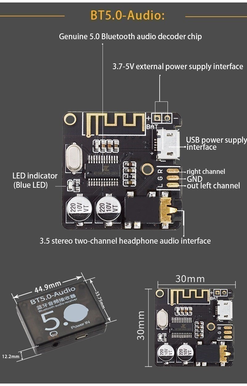 VHM-314 Bluetooth Audio Receiver Board Bluetooth 5.0 4.1 MP3 Lossless Decoder Board Wireless Stereo Music Module DIY Micro / Type-C USB 3.7V-5V