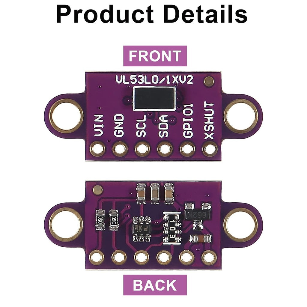 The VL53L0X is a great IC, but its small, leadless, LGA package makes it difficult for the typical student or hobbyist to use. It also operates at a recommended voltage of 2.8 V, which can make interfacing difficult for microcontrollers operating at 3.3 V or 5 V. Our breakout board addresses these issues, making it easier to get started using the sensor, while keeping the overall size as small as possible.