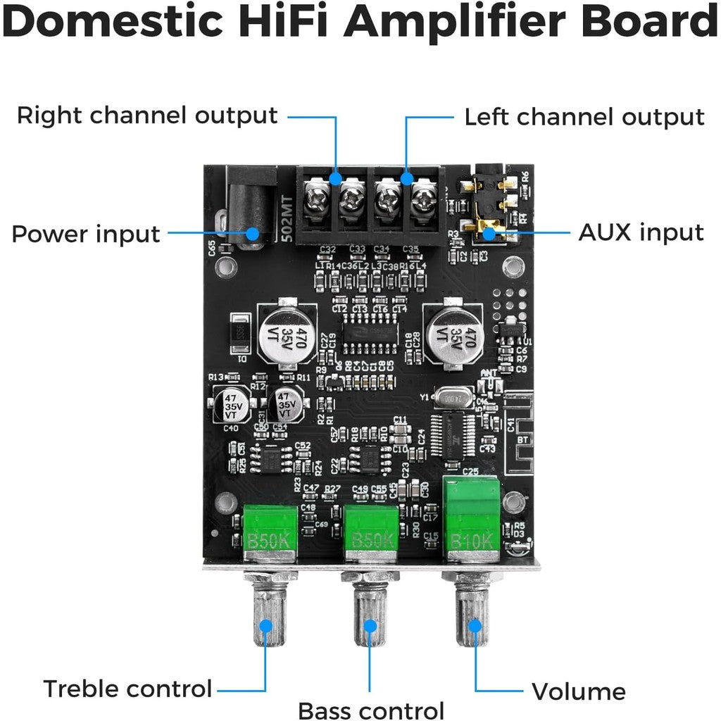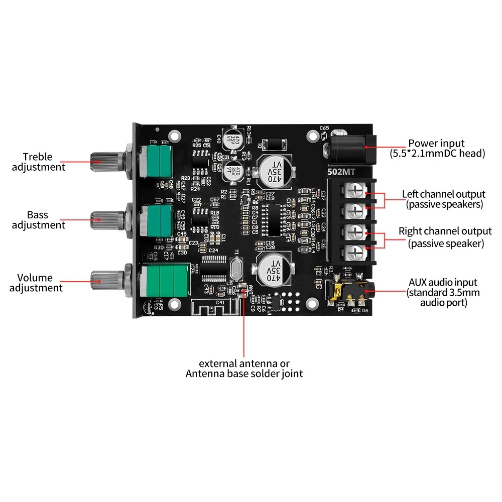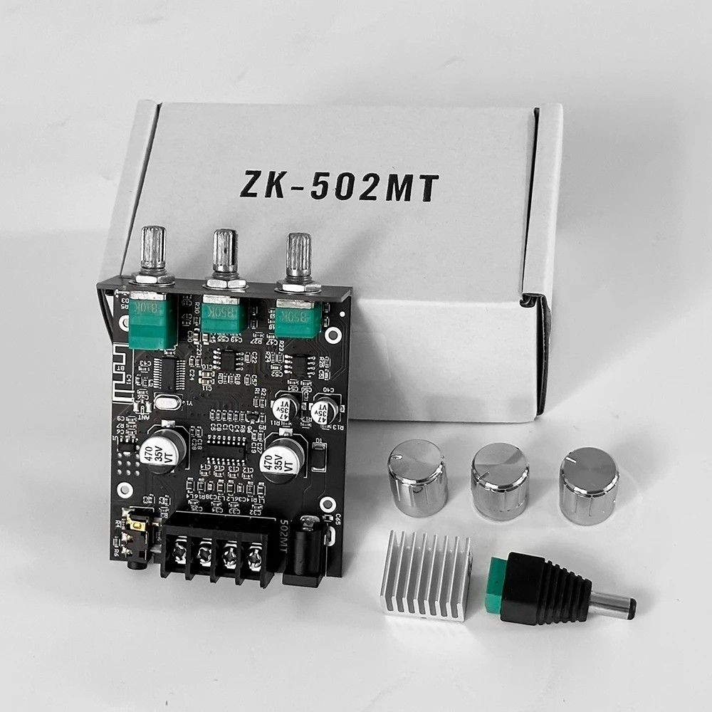 ZK-502MT Bluetooth Amplifier Board 50W+50W 2.0 Channel Amp Board with Treble and Bass Control DC 9-24V Bluetooth and AUX Inputs Audio Amp Board for Home DIY Wireless Speakers